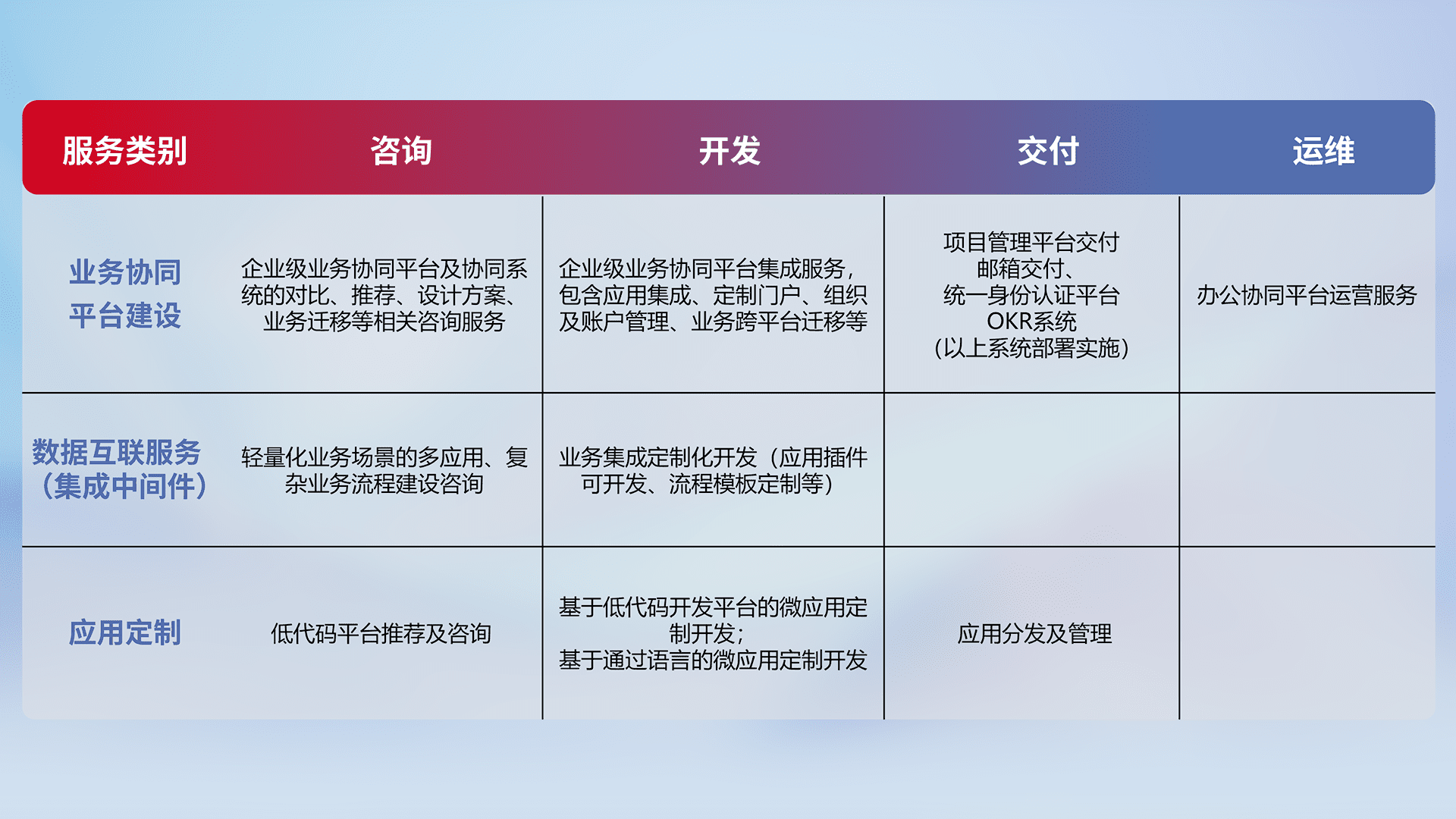 针对钉钉、、企微、、IDaas等平台级产品提供产品的规划、、、方案、、交付、、定制化开发等服务,,,实现如统一协同办公、、、智能客户服务、、混合会议管理、、、智能数据查询、、、、等业务场景,,,,实现数字化转型。。。