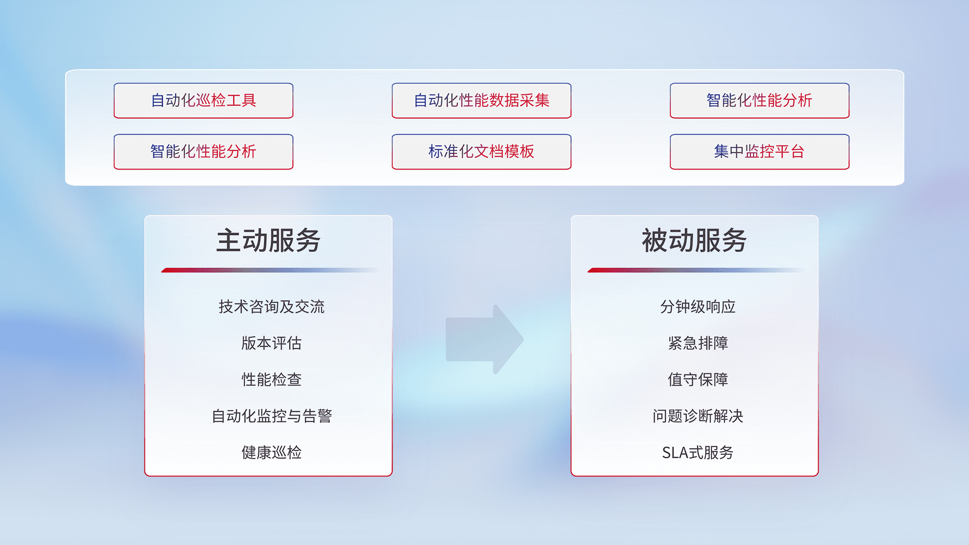 智能化工具和标准化文档,,保障服务质量,,提供主动服务(包含技术咨询、、、、版本评估、、、性能检查、、、自动化监控与告警、、、健康巡检)和被动服务包含(分钟级响应、、、、紧急排障、、值守保障、、、、问题诊断解决、、、、SLA服务)。。。。
